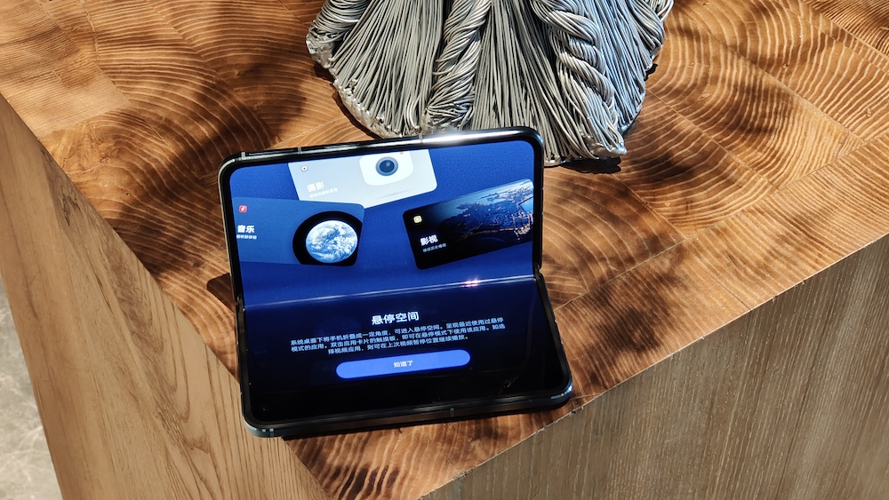 在这种硬件做工的合作下,“帐子” 形式用起来就有了新鲜感,体会也不错,不过适配的运用还有待持续更新。能够完成悬停观影、分屏、小窗等功能,在摄影时,得益于可悬停铰链的规划,能够完成折叠取景作用。
