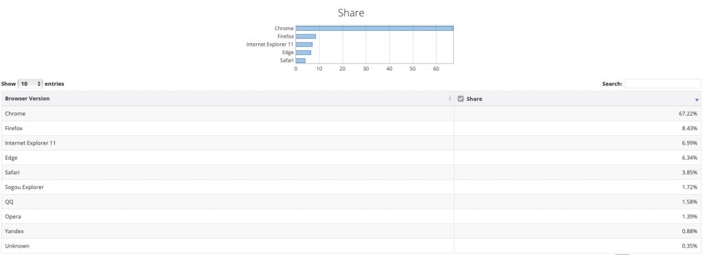 Google Chrome 依然是市场比例最大的浏览器,占 67.22%,其次是 Mozilla Firefox,占 8.43%,第三名是 Internet Explorer,占 6.99%,同归于微软的 Edge UWP 仅占 6.34%,位列第四。
